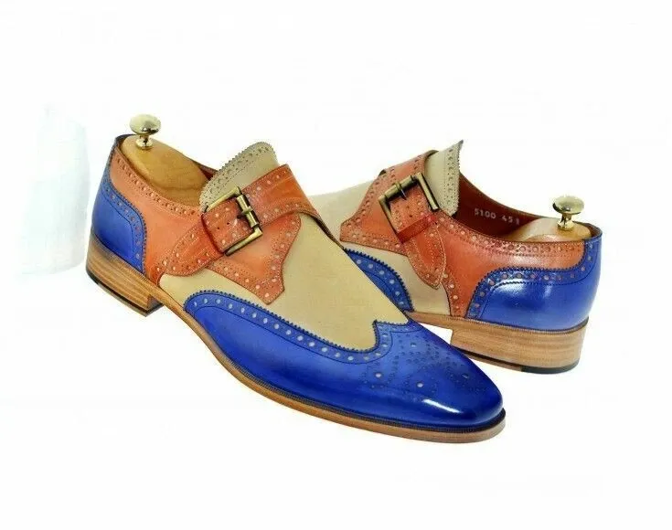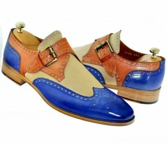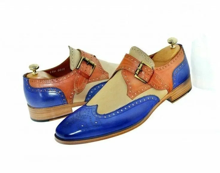 Men’s Handmade Three Toned Multi Leather Oxford Wing Tip Monk Strap Brogue Shoes