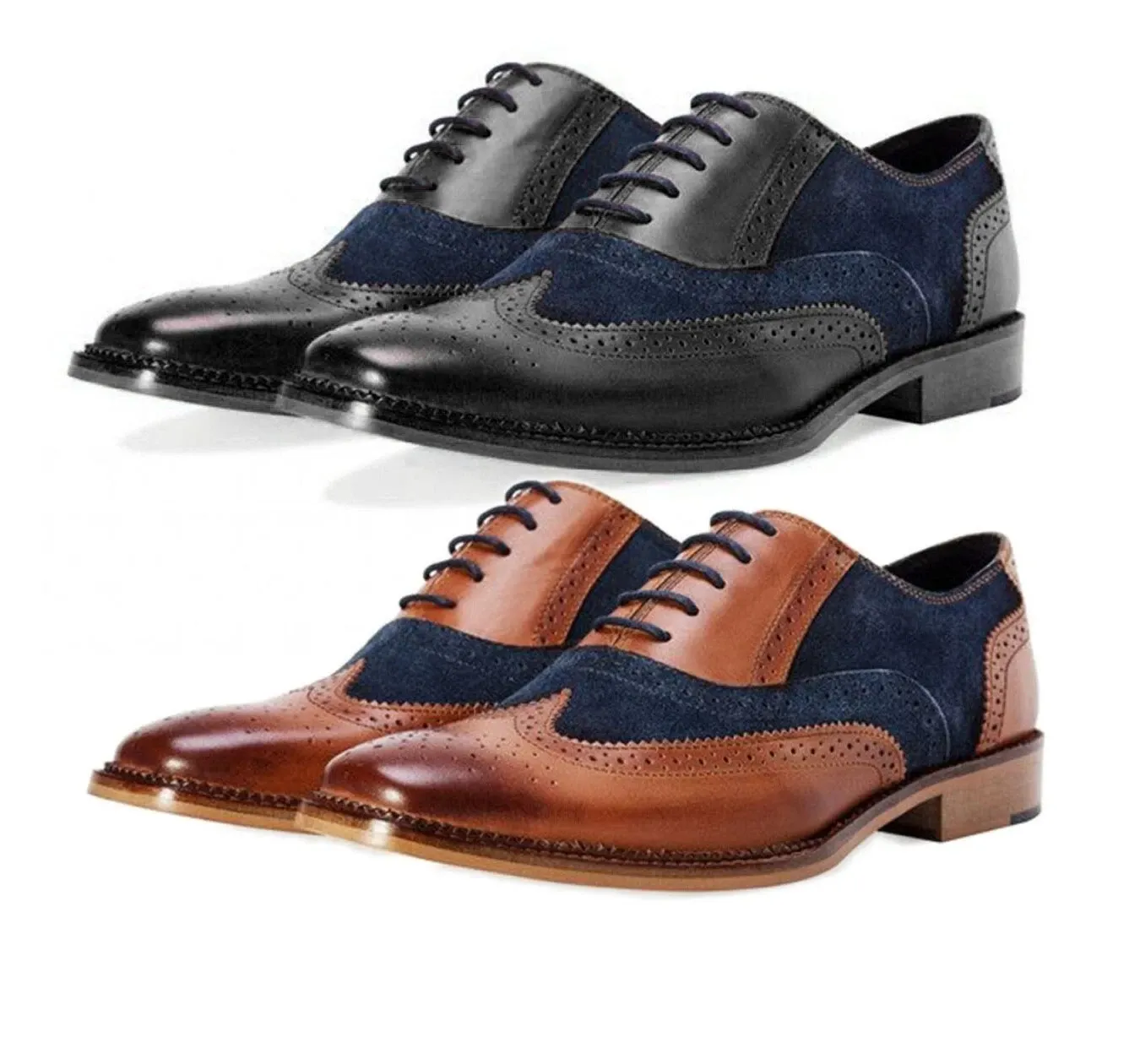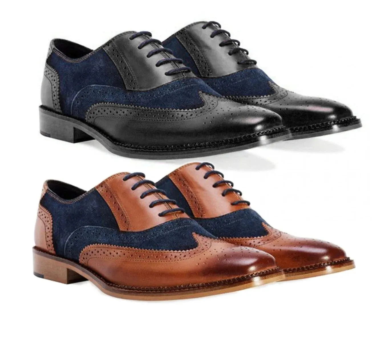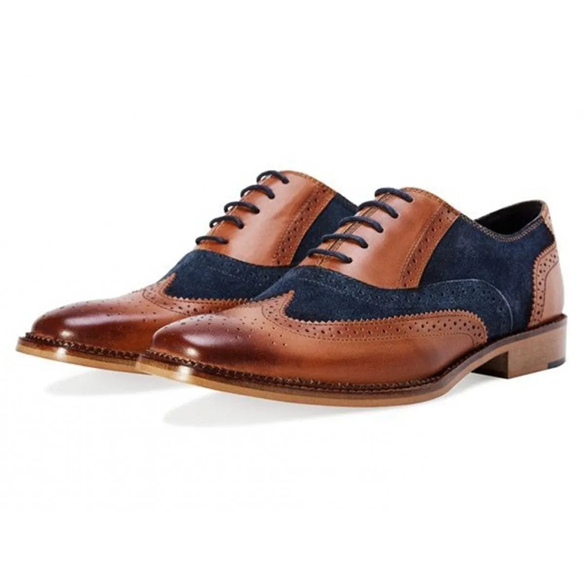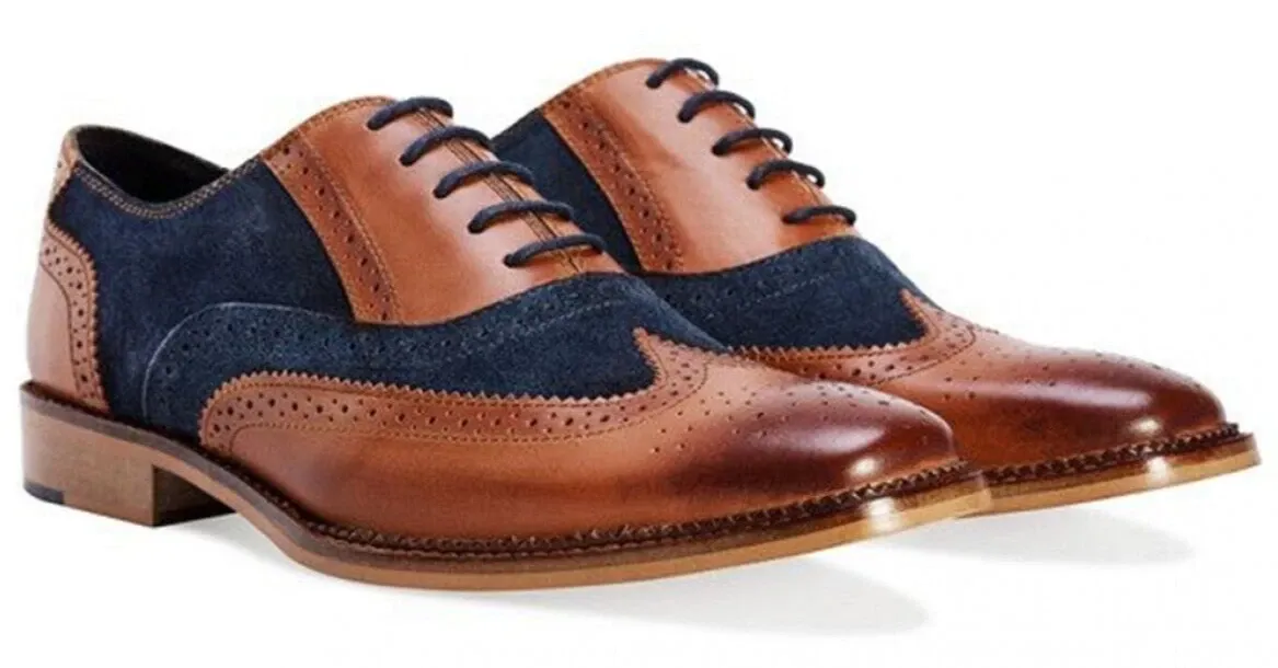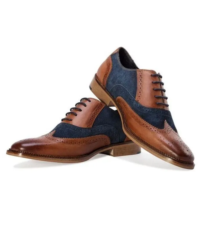 Men’s Handmade Two Toned Brown Leather Navy Suede Wing Tip Brogue Lace Up Shoes